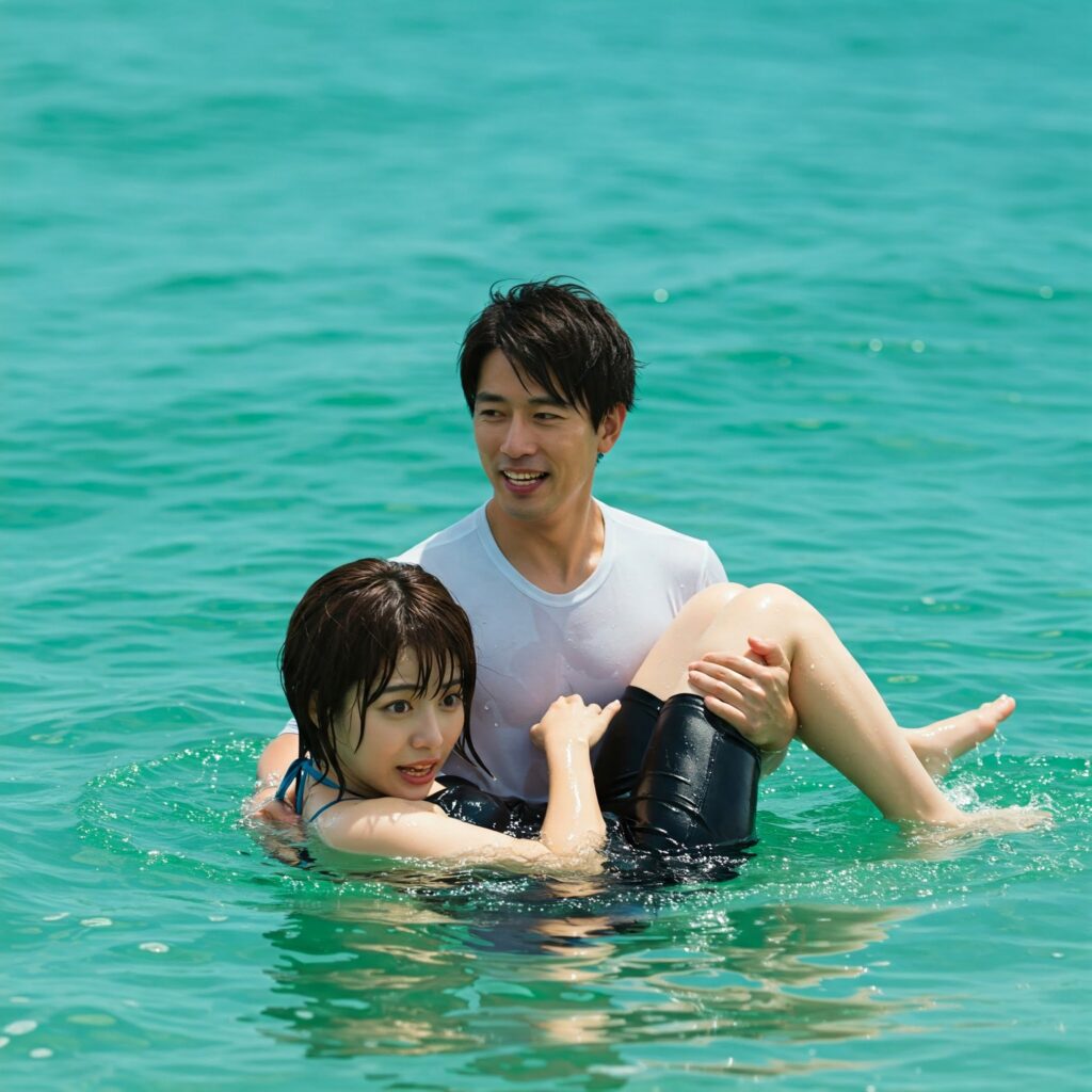 陽子は相変わらず波打ち際で脚を濡らすだけだったが、ゼンが後ろからそっと近づき、陽子の身体を抱き上げた。お姫様だっこのまま海へ入っていく。